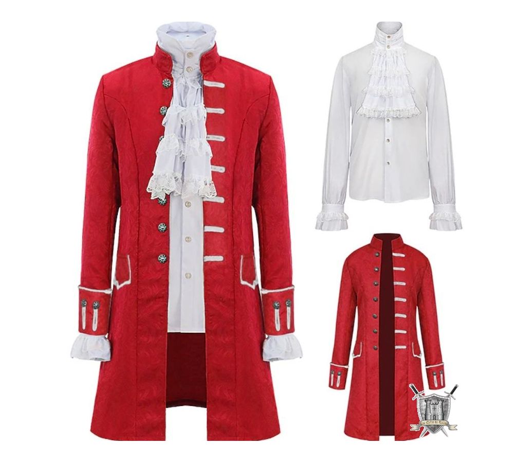 Ensemble grand siècle composé de la redingote en tissu damascé et de la chemise à jabot