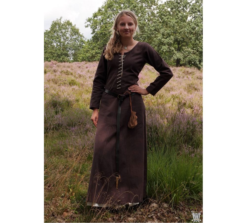 La longue robe médiévale est découpée en tissu de coton solide (toile). Dans la partie jupe, les cales en tissusont utilisés, qui produisent une généreuse amplitude. Le centre avant est lacé avec une bande de coton solide et peut être personnalisé pour le corps. Les extrémités du ruban sont équipées d’une pointe, de sorte que le ruban peut être facilement tiré à travers les œillets brodés.